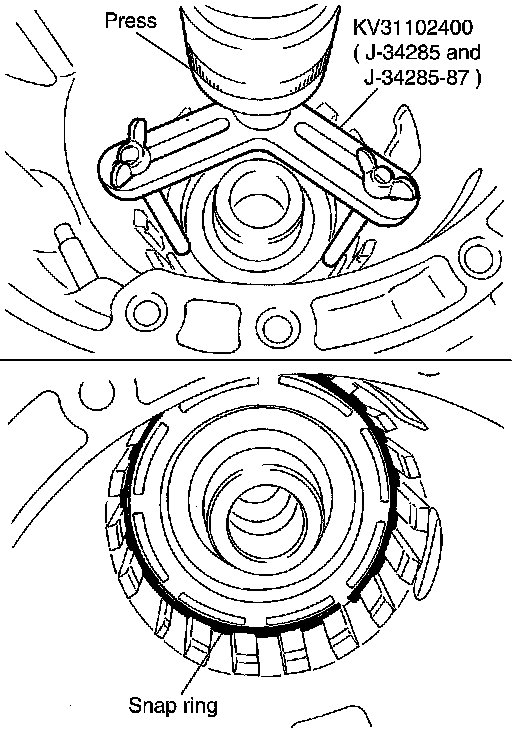 13.Set the clutch spring compressor on reverse brake spring retainer and install snap ring (fixing spring retainer) in transmission case while compressing return spring.