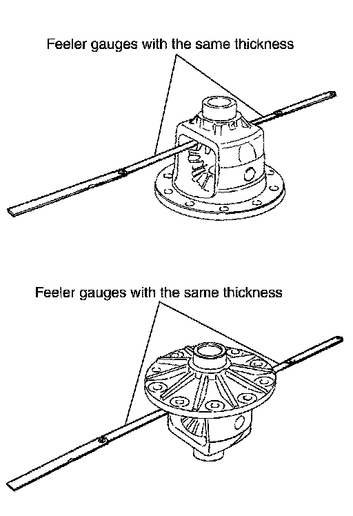 To prevent side gear from tilting, insert feeler gauges with the same thickness from both sides.