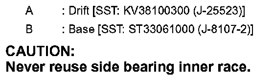 11.Press side bearing inner races to differential case, using the drift (A) and the base (B).
