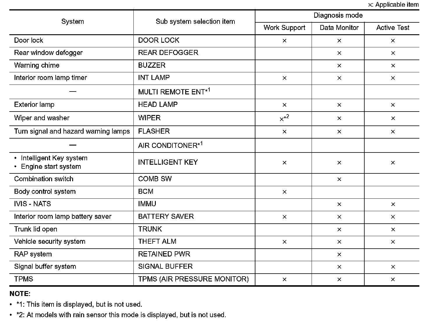 It can perform the diagnosis modes except the following for all sub system selection items.