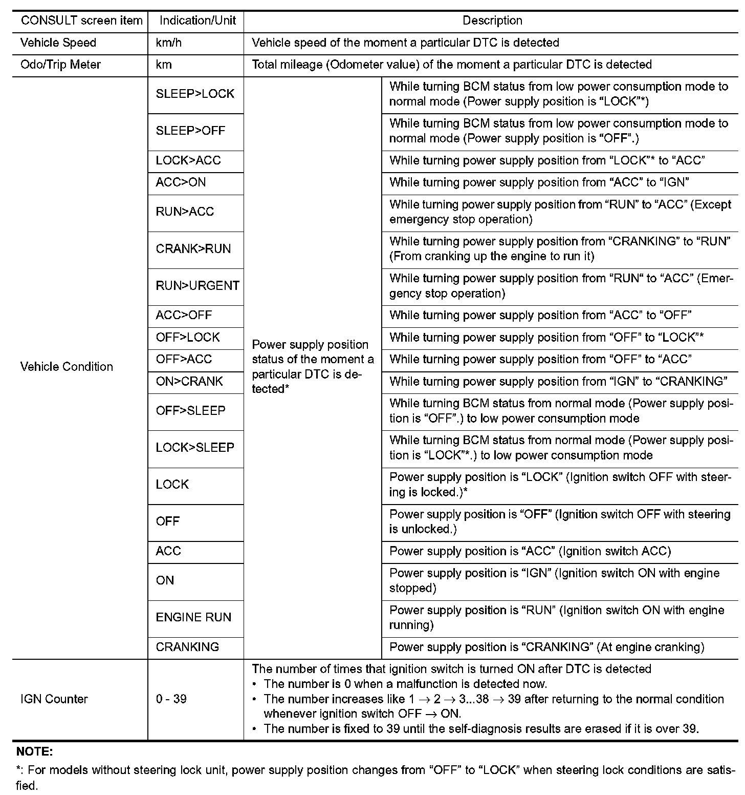 The BCM records the following vehicle condition at the time a particular DTC is detected, and displays on