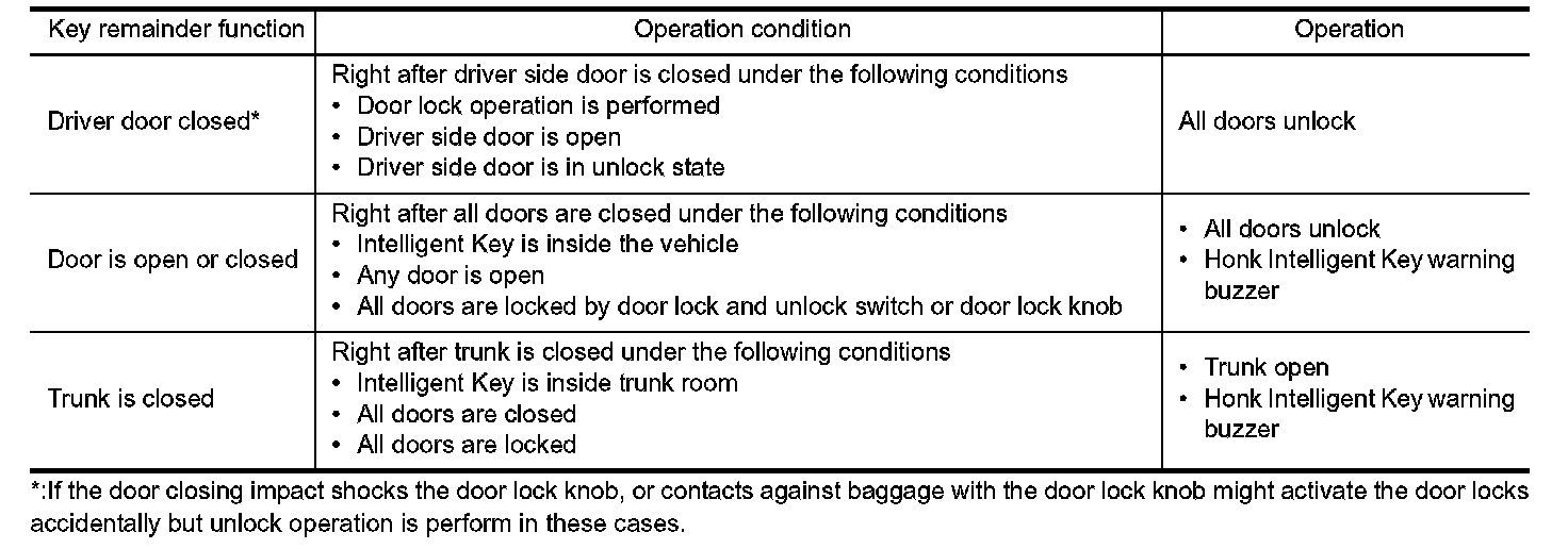 - The above function operates when the Intelligent Key is inside the vehicle. However, there may be times when the Intelligent Key cannot be detected, and this function does operate when the Intelligent Key is on the instrument panel, rear parcel shelf, or in the glove box. Also, this system sometimes does not operate if the Intelligent Key is in the door pocket for the open door.