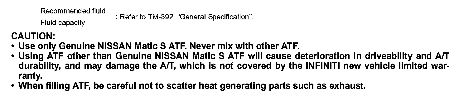 - Use only Genuine NISSAN Matic S ATF. Never mix with other ATF.