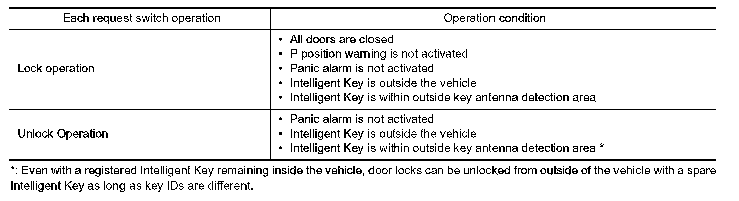 When all doors are locked, ignition switch is in OFF position and key switch is OFF (Intelligent Key is not inserted in key slot), doors are unlocked with door request switch