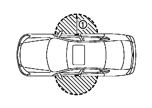 The outside key antenna detection area of door lock/unlock function is in the range of approximately 80 cm (31.50 in) surrounding the driver, passenger door handles (1). However, this operating range depends on the ambient conditions.
