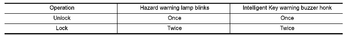 During lock, unlock, operation by each request switch, the hazard warning lamps and Intelligent Key warning buzzer will blink or honk as a reminder.