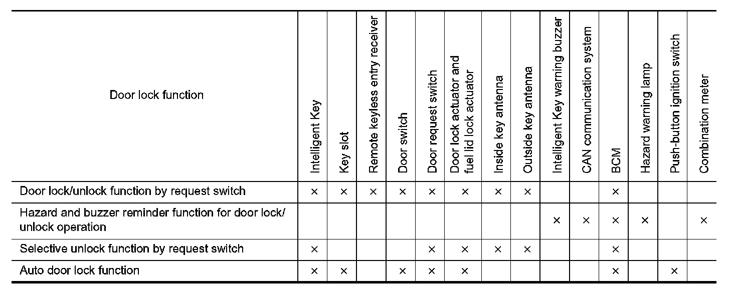 - BCM lock/unlock each door and fuel lid and sounds Intelligent Key buzzer warning (lock: 2 time, unlock: 1