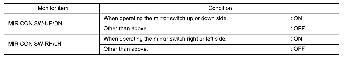 Check the operation on "MIRCONSW-UP/DN" and "MIRCONSW-RH/LH" in "DATA MONITOR" mode using CONSULT.