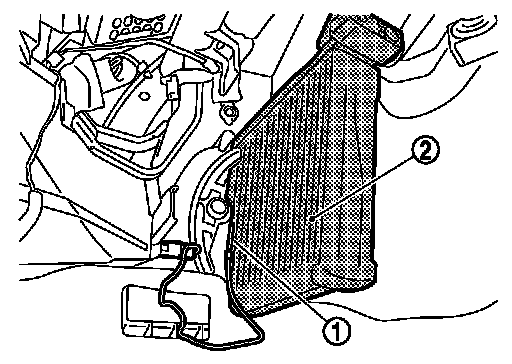 The intake sensor (1) is located on the evaporator. It converts air temperature after it passes through the evaporator (2) into a resistance value which is then input to the unified meter and A/C amp.