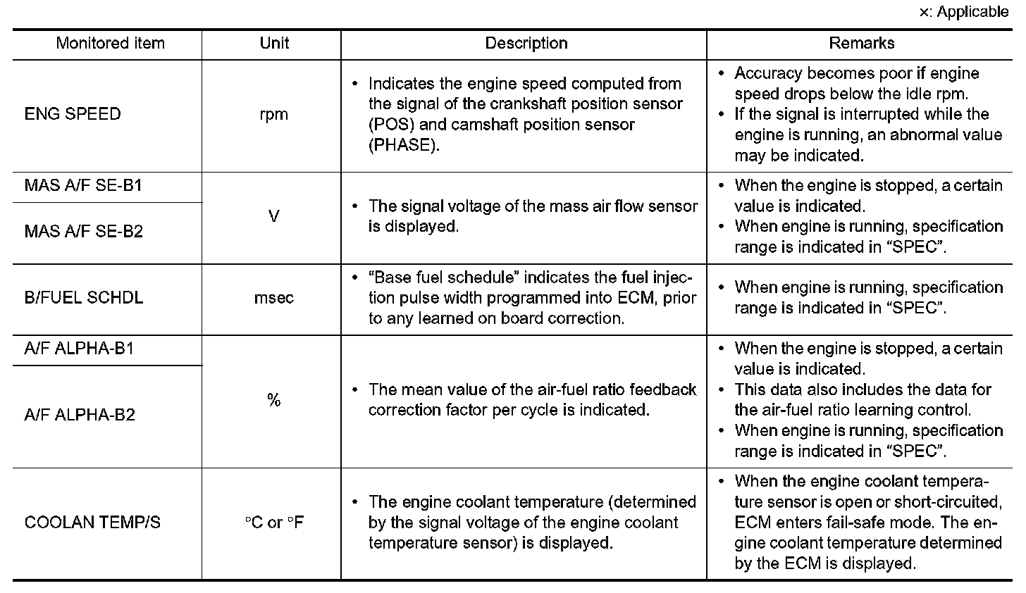 Any monitored item that does not match the vehicle being diagnosed is deleted from the display automatically.