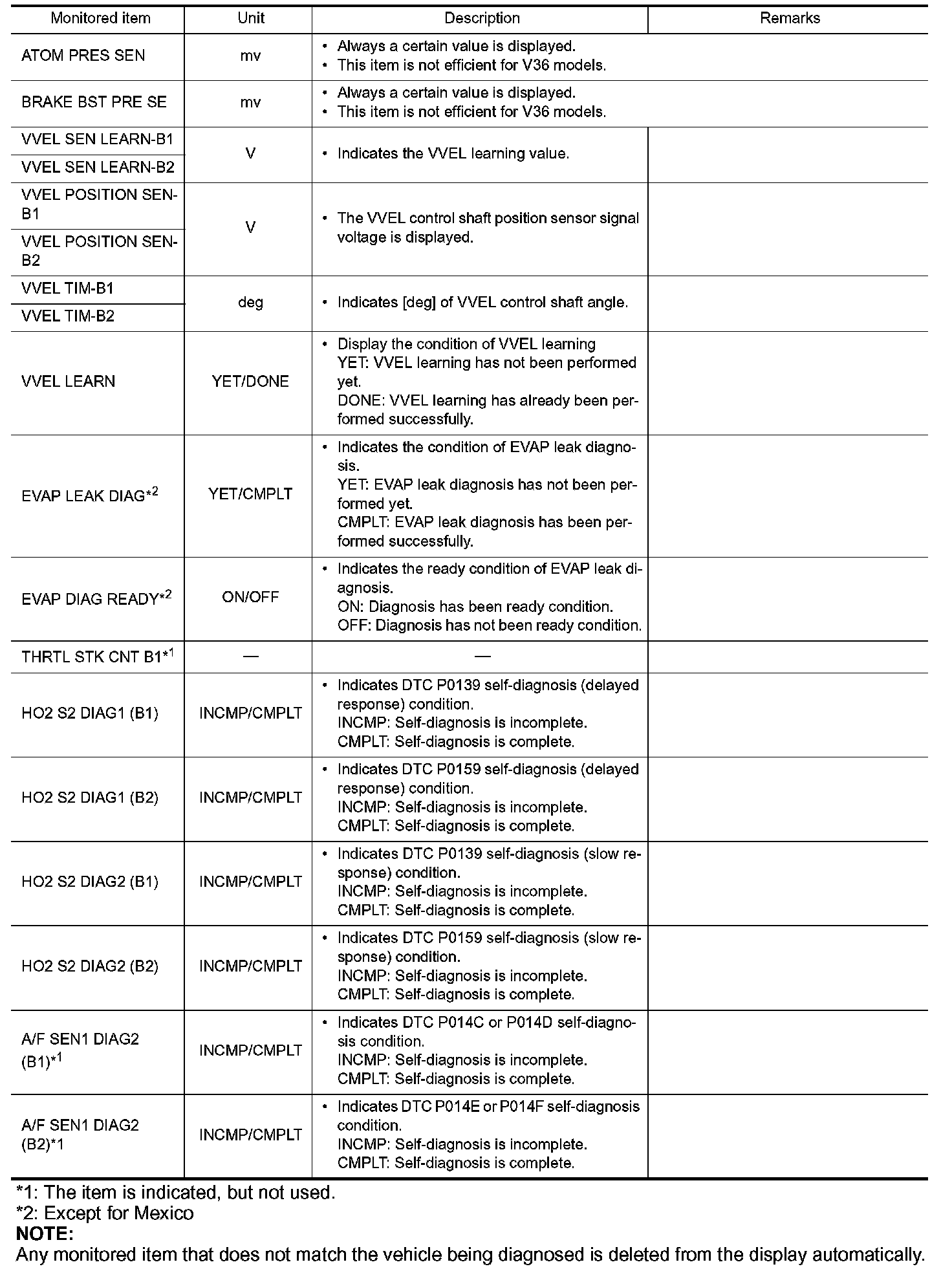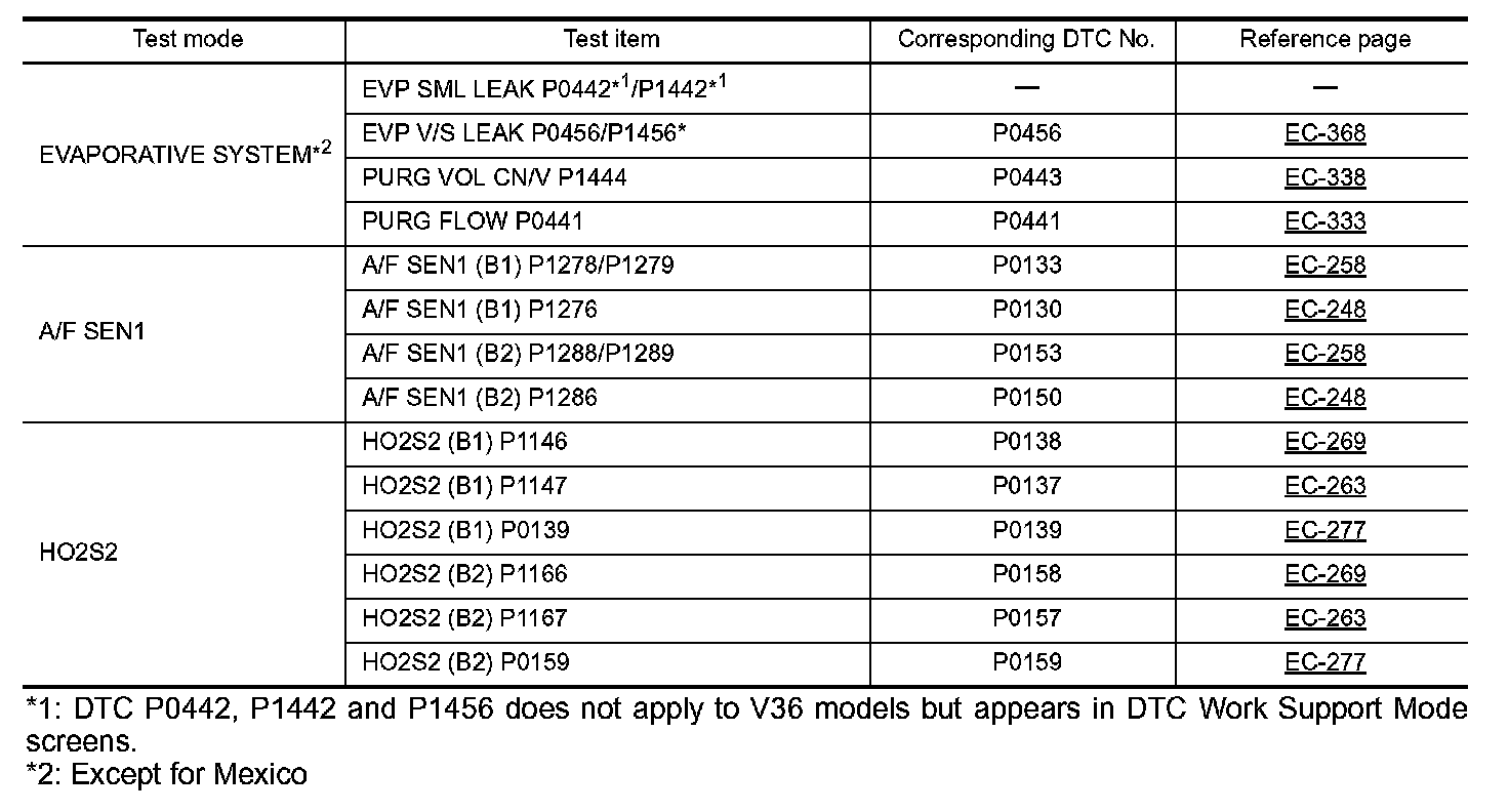 *1: DTC P0442, P1442 and P1456 does not apply to V36 models but appears in DTC Work Support Mode screens.