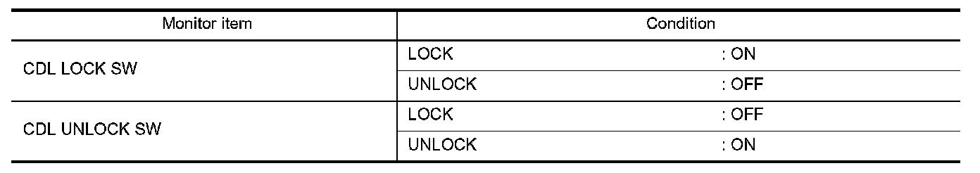 Check ("CDL LOCK SW ", "CDL UNLOCK SW") in "DATA MONITOR" mode for "POWER DOOR LOCK SYSTEM" with CONSULT. Consult Function.