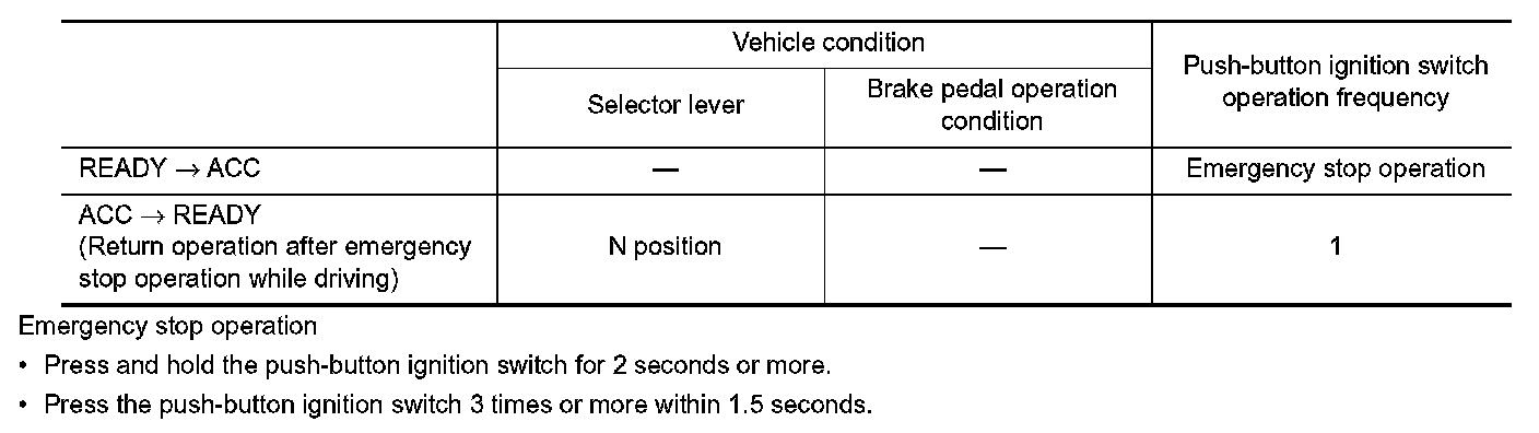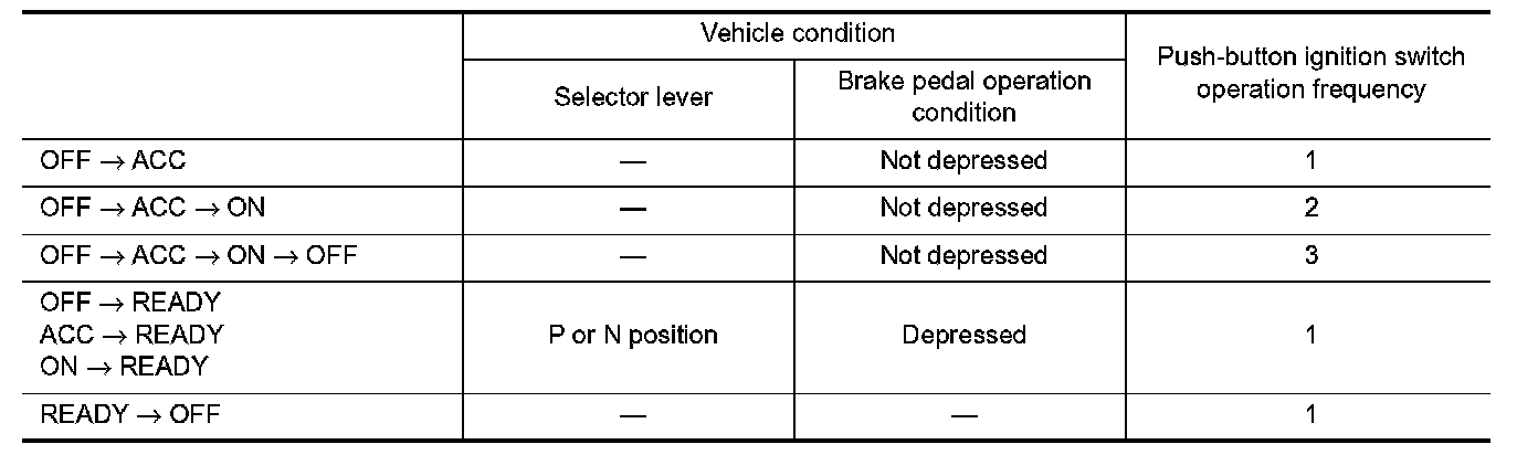 READY SET CONDITION TABLE BY PUSH-BUTTON IGNITION SWITCH OPERATION