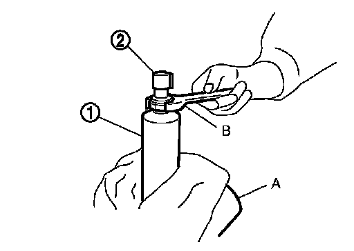 2.Fix the liquid tank (1) with a vise (A). Remove the refrigerant pressure sensor (2) with a wrench (B).