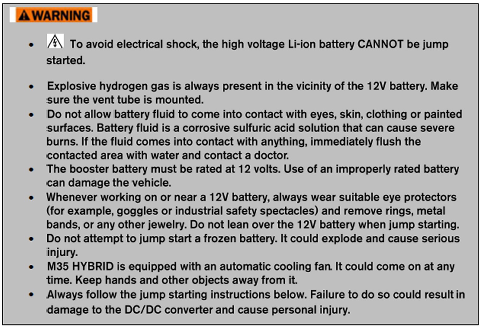 Jumper cable connections under the hood of the M35 HYBRID are not connected directly to a battery. They are connected to chassis ground and a fuse box terminal. Refer to the following instructions and the above illustration.