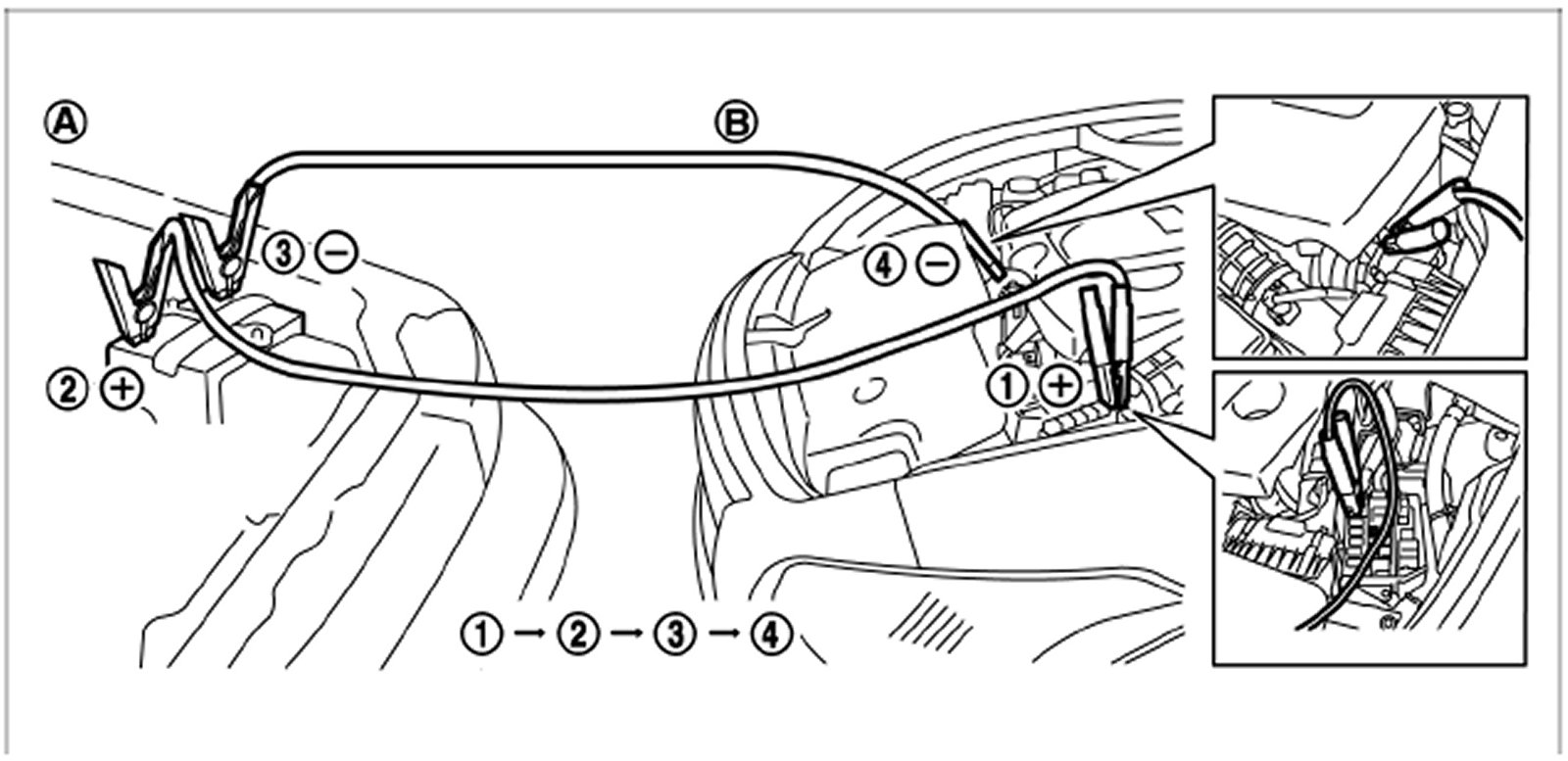 4. Start the engine of the booster vehicle (A) and let it run for a few minutes.