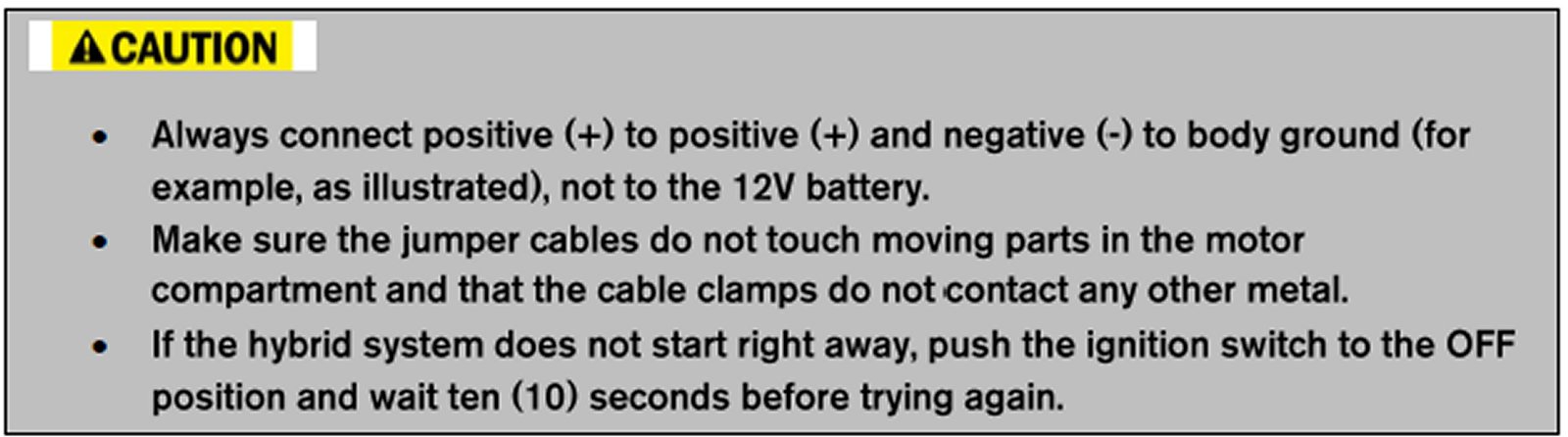 To start the hybrid system with a booster battery, the instructions and precautions below must be followed.