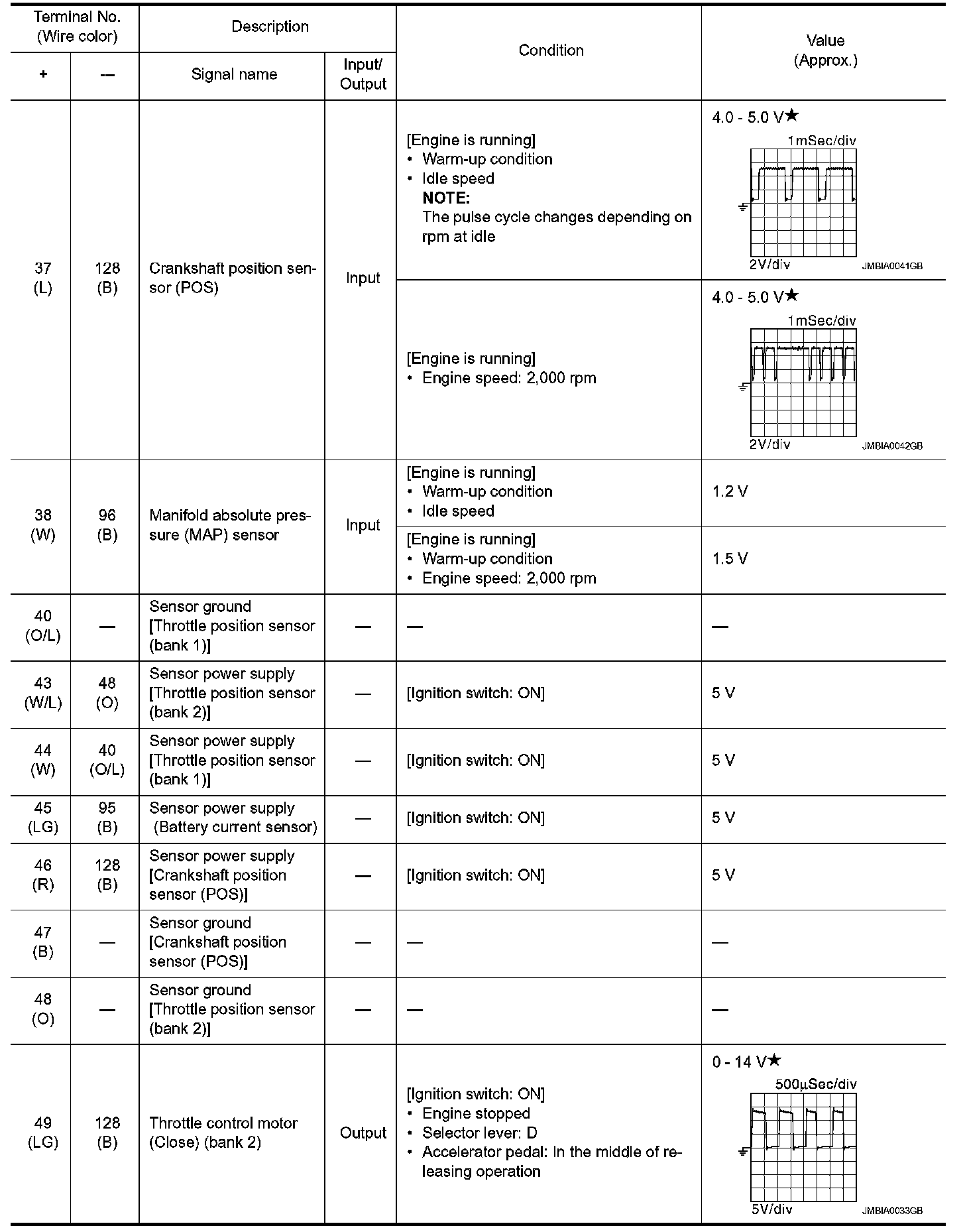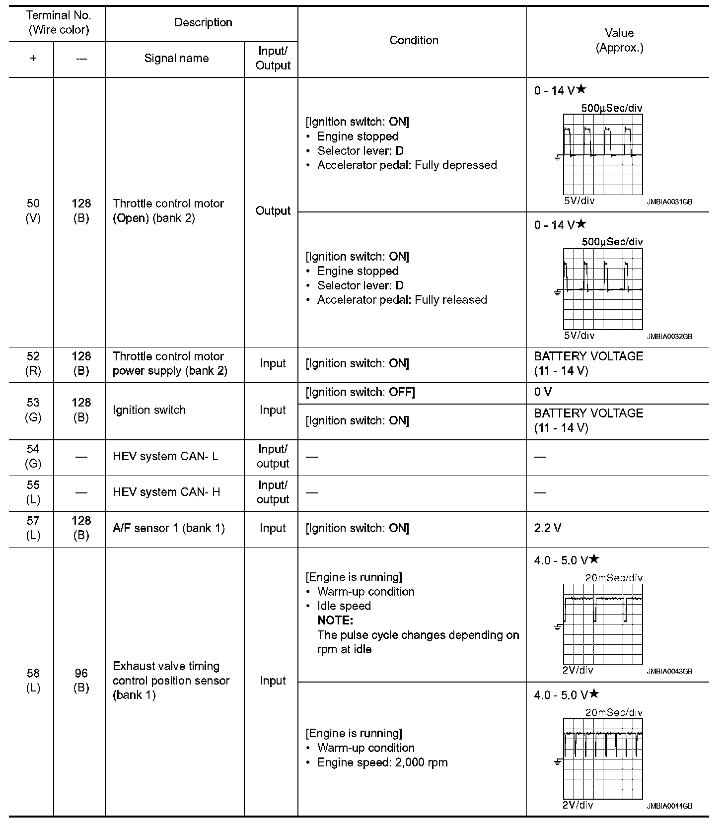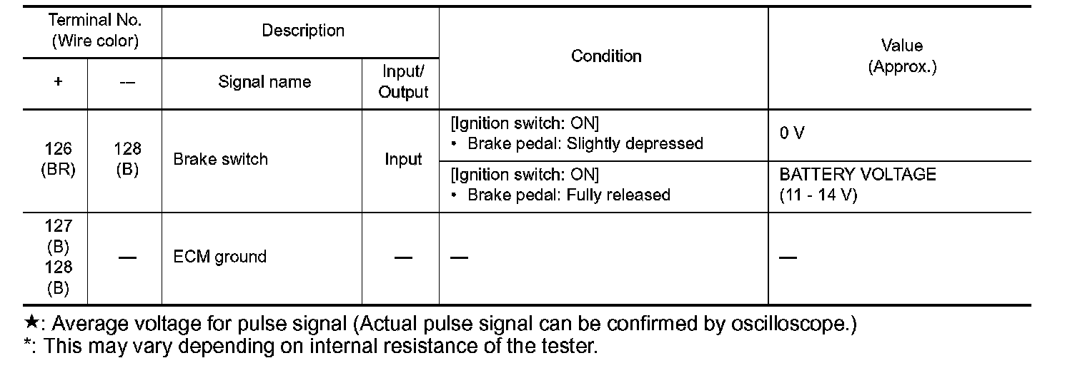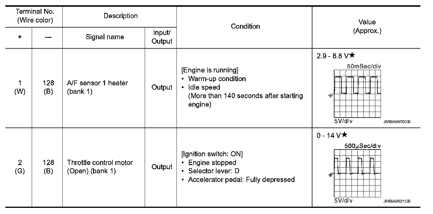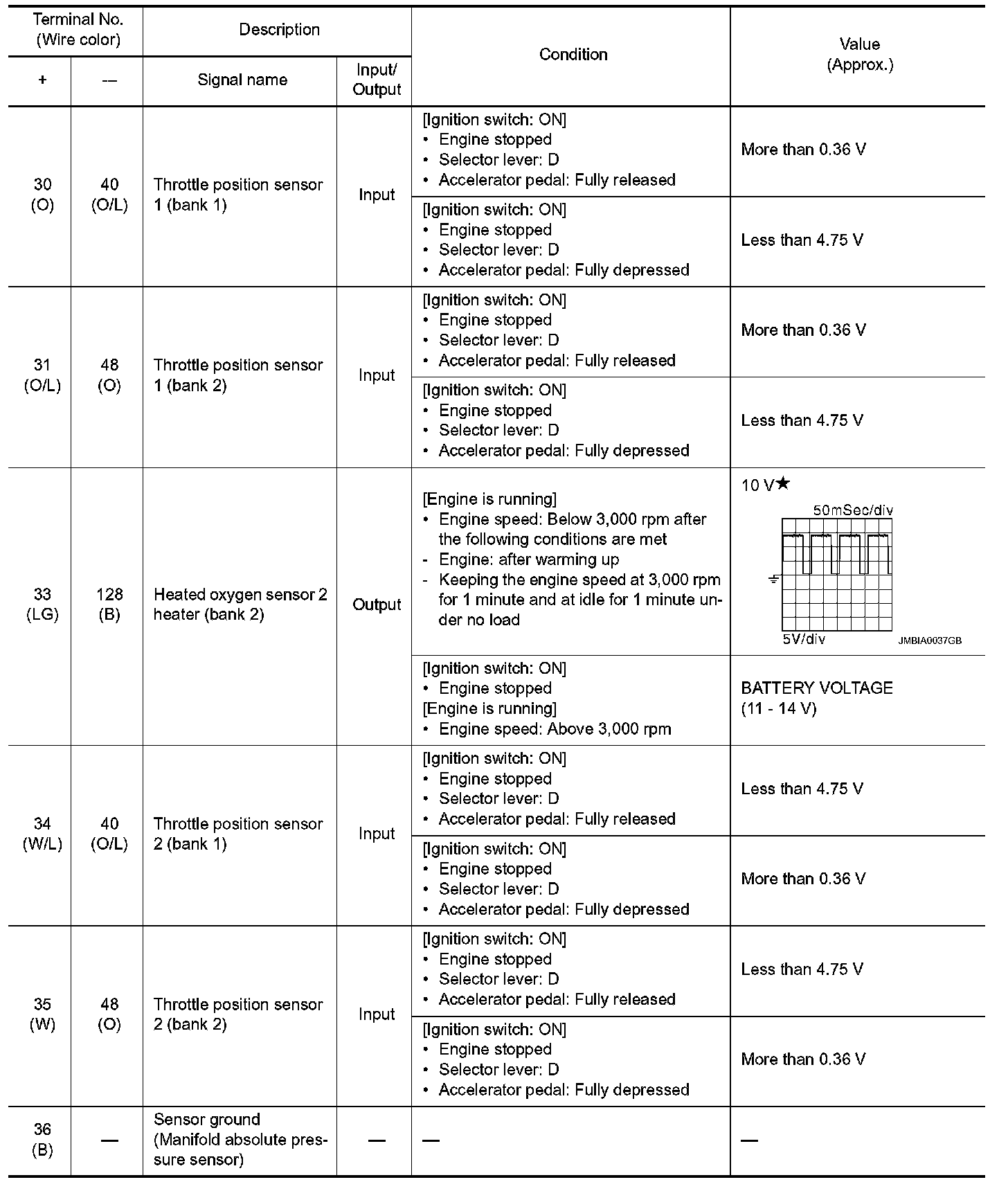 *: Throttle position sensor 2 signal are converted by ECM internally. Thus, they differ from ECM terminals voltage signal.