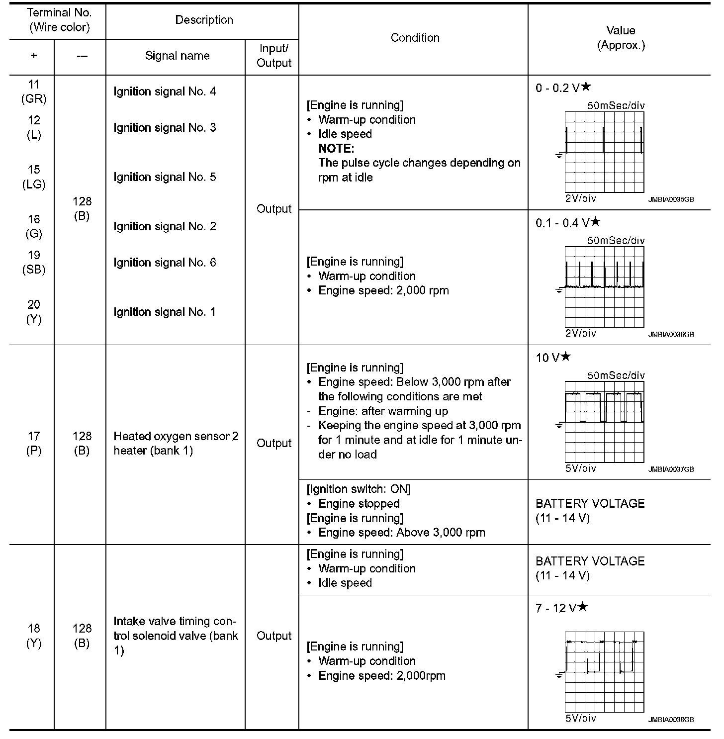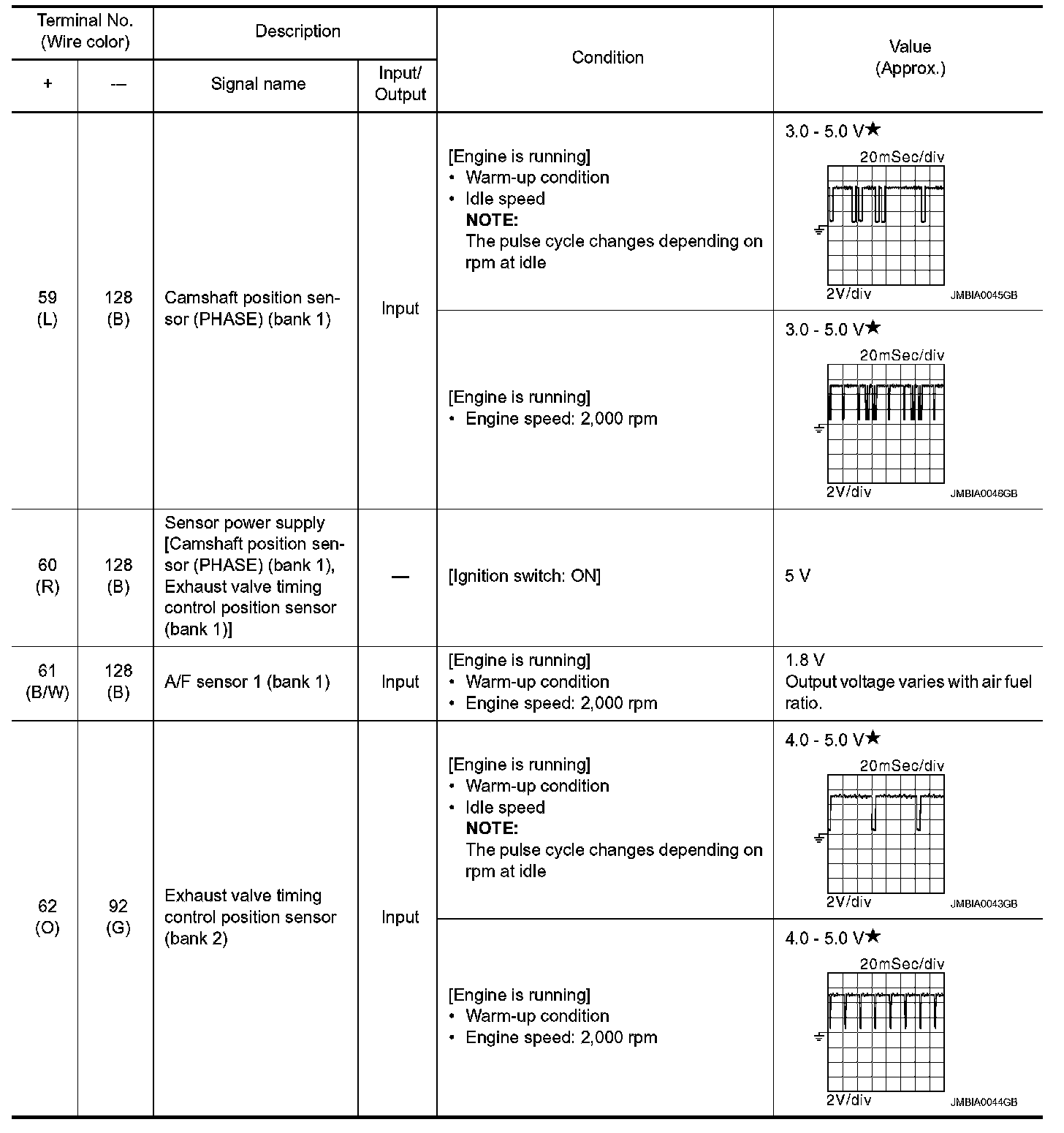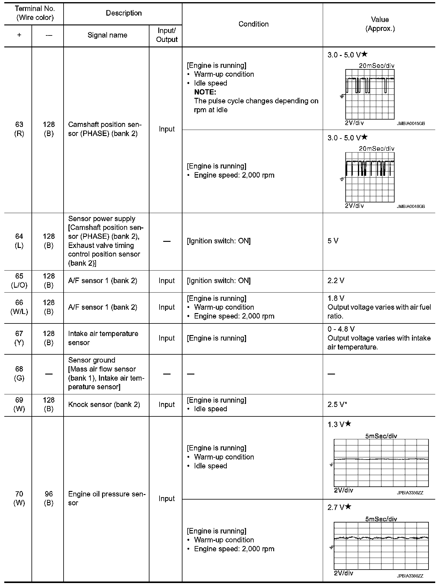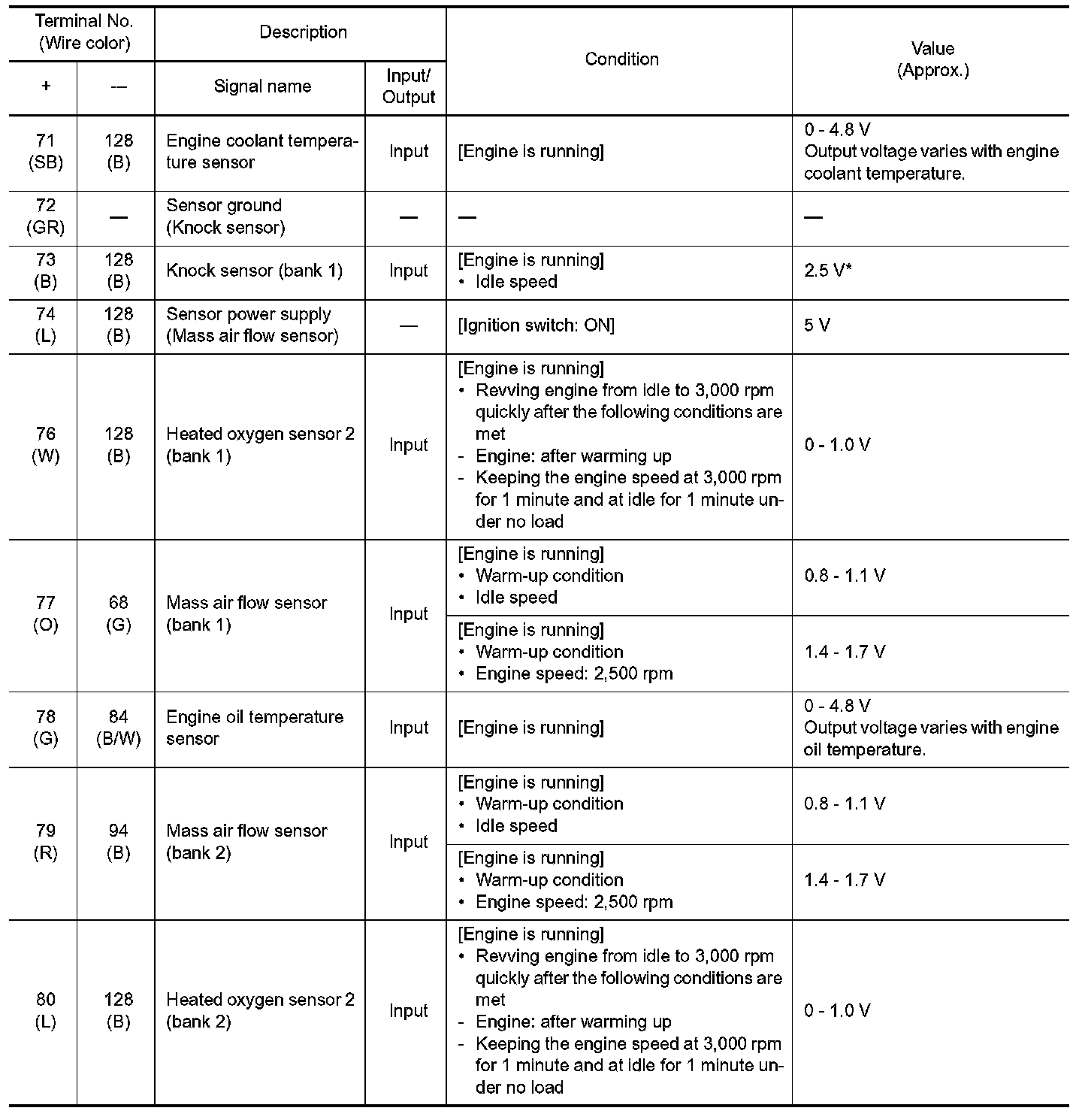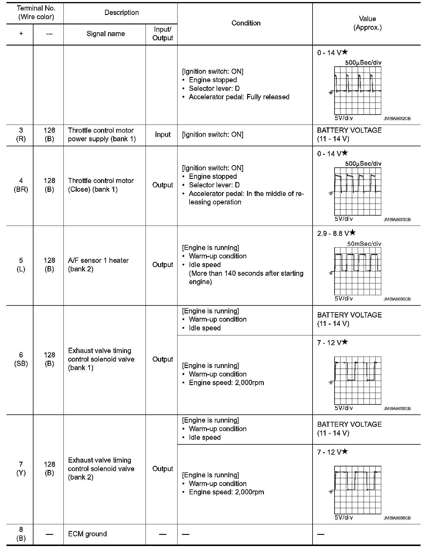 *: Throttle position sensor 2 signal are converted by ECM internally. Thus, they differ from ECM terminals voltage signal.