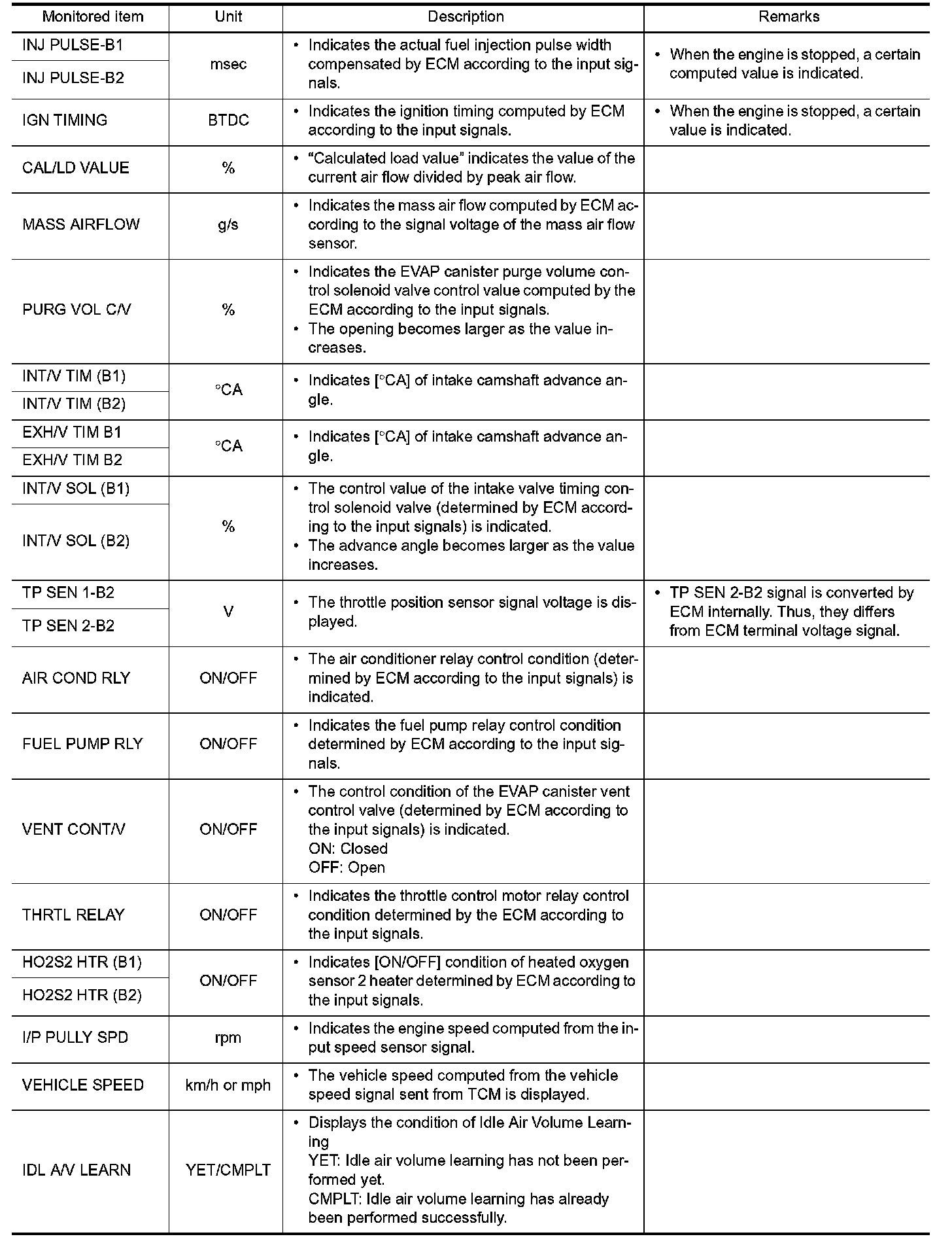 Any monitored item that does not match the vehicle being diagnosed is deleted from the display automatically.