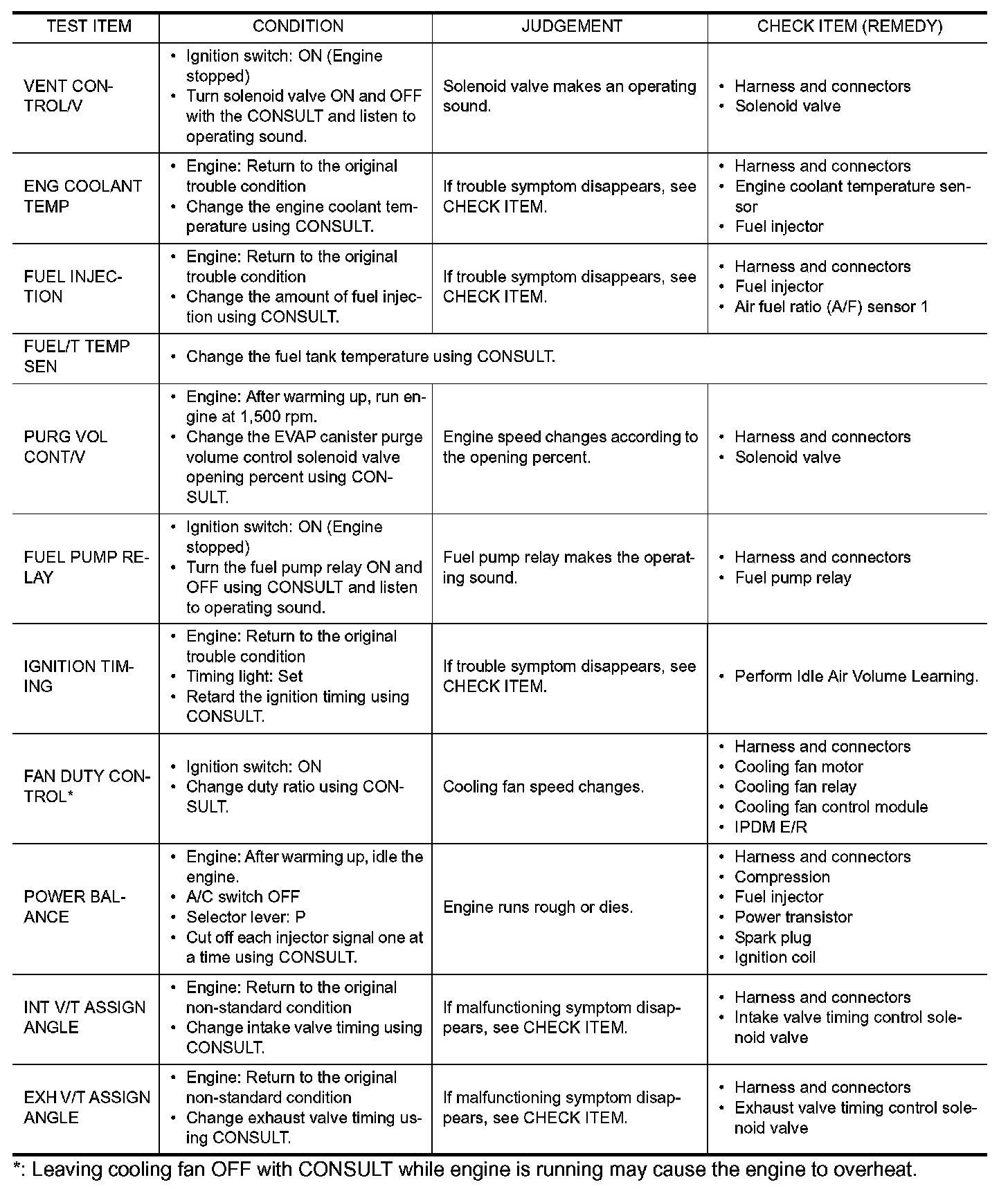 *: Leaving cooling fan OFF with CONSULT while engine is running may cause the engine to overheat.