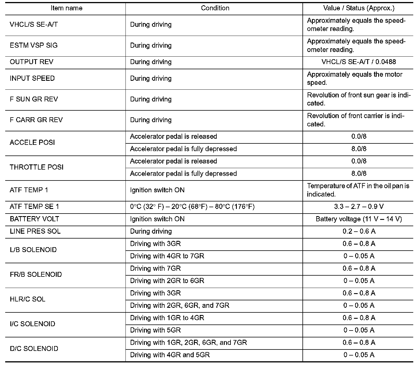 3.Display of solenoid valves on CONSULT changes at the start of shifting, while gear position is displayed upon completion of shifting (which is computed by TCM).