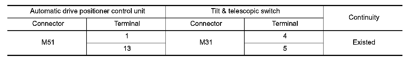3.Check continuity between automatic drive positioner control unit harness connector and tilt & telescopic switch harness connector.