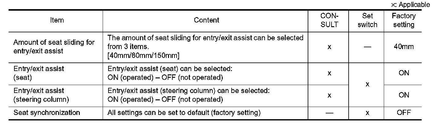 The settings of the automatic driving positioner system can be changed, using CONSULT, the display unit in the center of the instrument panel and the set switch. Always check the settings before and after disconnecting the battery terminal or replacing driver seat control unit.