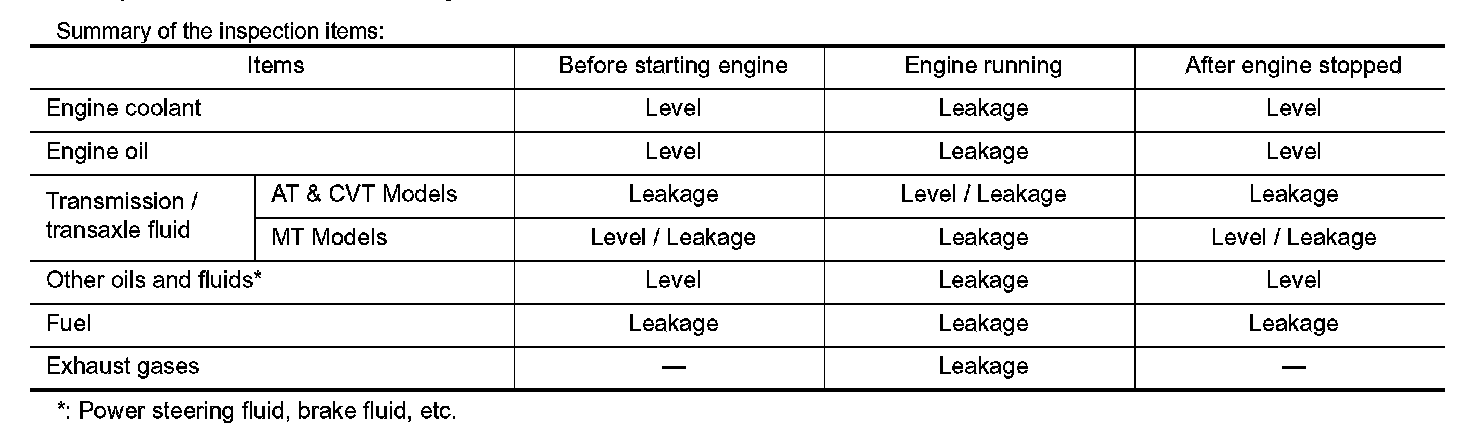 - Warm up engine thoroughly to check that there is no leakage of fuel, or any oil/fluids including engine oil and engine coolant.