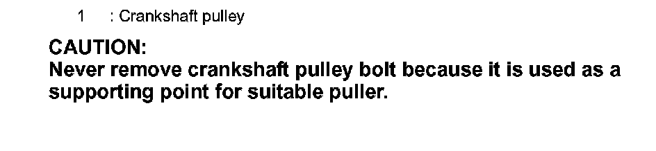 Never remove crankshaft pulley bolt because it is used as a supporting point for suitable puller.