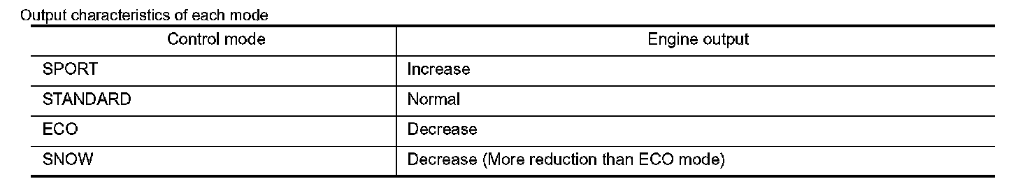 - Engine output characteristics after switching mode by operating the drive mode select switch are as follows.