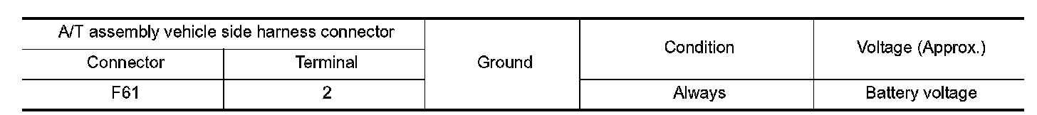 Check voltage between A/T assembly vehicle side harness connector terminals and ground.