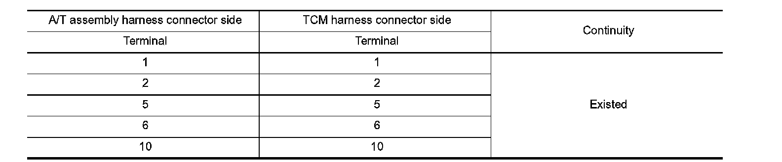 Check continuity between A/T assembly vehicle side harness connector terminals and ground.