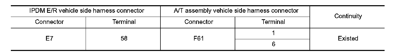 3.Check continuity between IPDM E/R vehicle side harness connector terminal and A/T assembly vehicle side harness connector terminals.