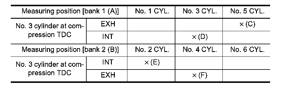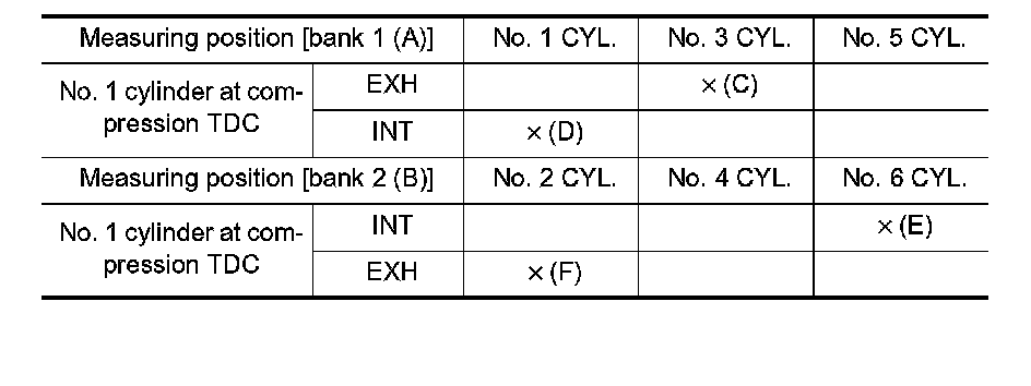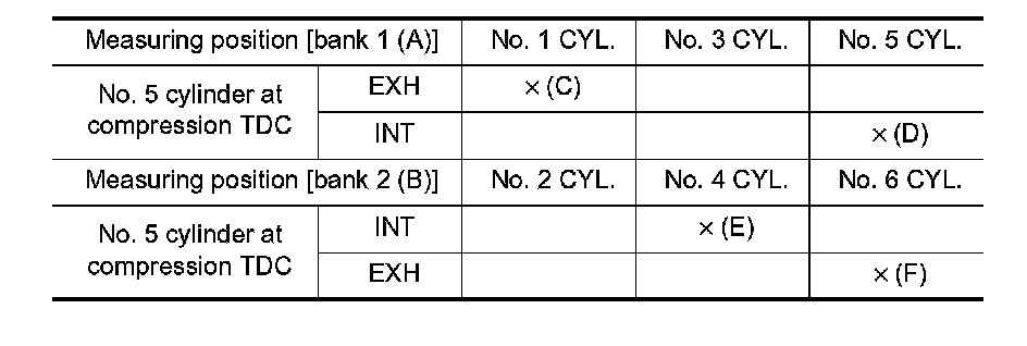 - By referring to the figure, measure the valve clearances at locations marked "�" as shown in the table below (locations indicated in the figure).