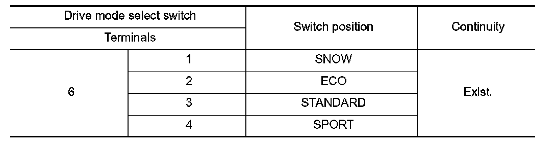 3.Check continuity between drive mode select switch connector terminal 6 and drive mode select switch connector terminals 1, 2, 3 and 4.