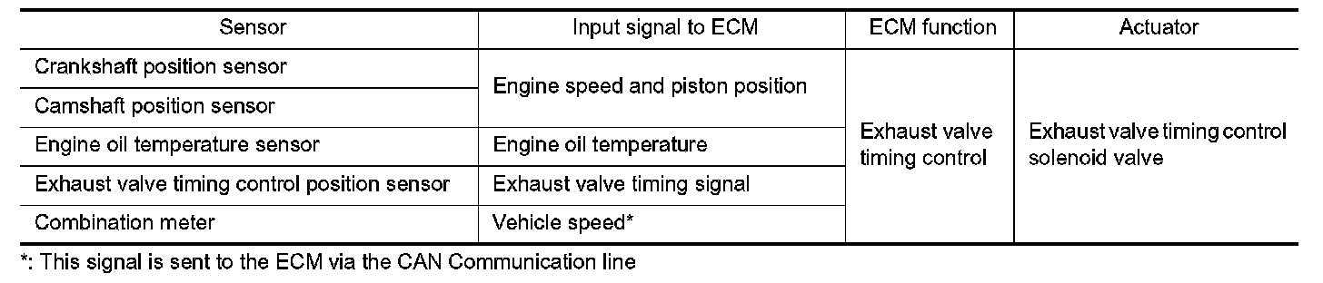 The ECM receives signals such as crankshaft position, camshaft position, engine speed, and engine oil temperature. Then, the ECM sends ON/OFF pulse duty signals to the exhaust valve timing control solenoid valve depending on driving status. This makes it possible to control the shut/open timing of the exhaust valve to increase engine torque and output in a range of high engine speed.
