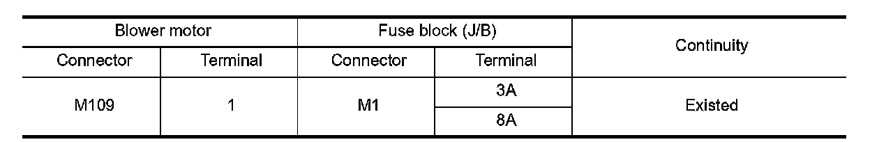 2.Check continuity between blower motor harness connector and fuse block (J/B) harness connector.