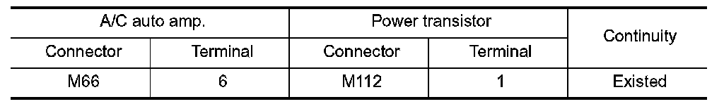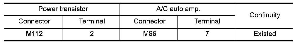 4.Check continuity between power transistor harness connector and A/C auto amp. harness connector.