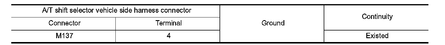 Check continuity between A/T shift selector vehicle side harness connector terminal and ground.