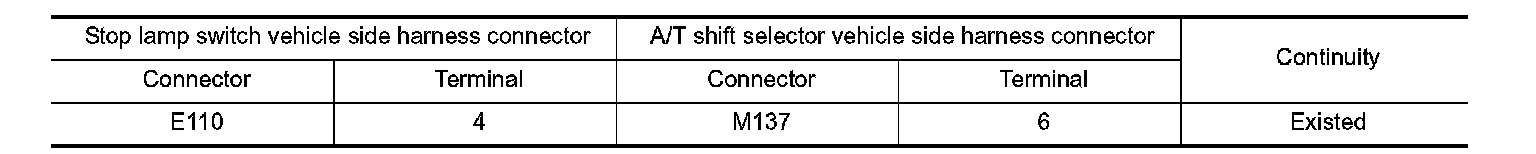 Check continuity between stop lamp switch vehicle side harness connector terminal and A/T shift selector vehicle side harness connector terminal.