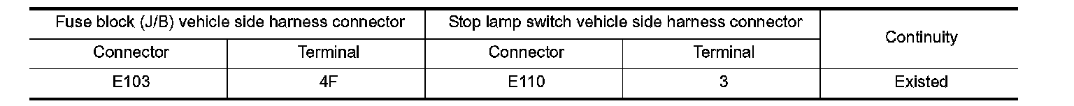 3.Check continuity between fuse block (J/B) vehicle side harness connector terminal and stop lamp switch vehicle side harness connector terminal.
