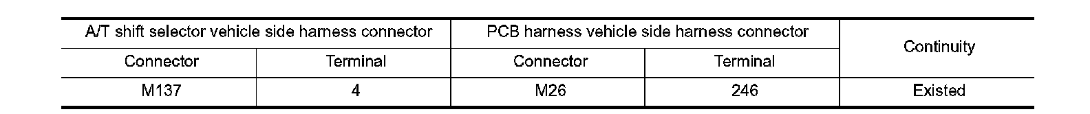 Check continuity between A/T shift selector vehicle side harness connector terminal and PCB harness vehicle side harness connector terminal.