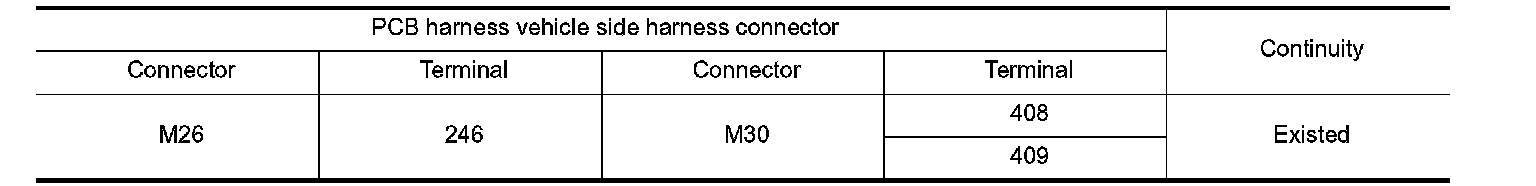 2.Check continuity between PCB harness vehicle side harness connector terminal and ground.