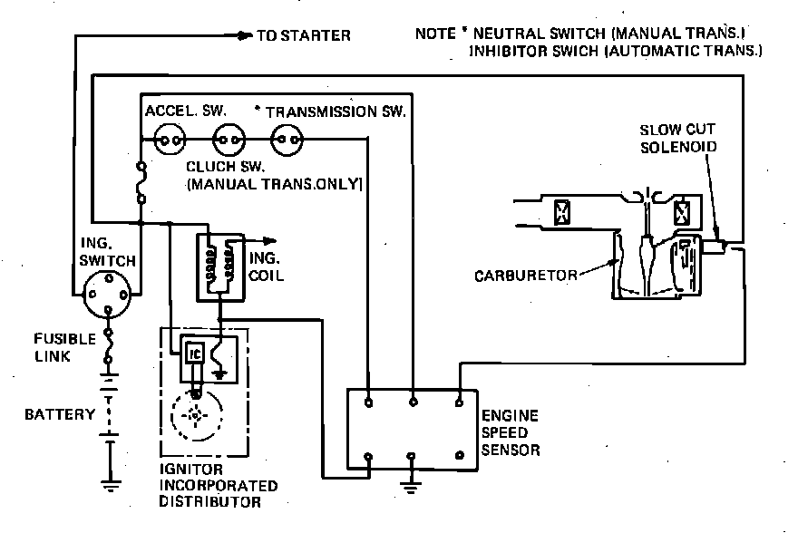 This system, Fig. 25, consists of a slow cut solenoid valve, an engine speed sensor, an accelerator switch, a clutch switch (manual transmission vehicles), and a transmission neutral (manual transmission vehicles) or inhibitor (automatic transmission vehicles) switch.