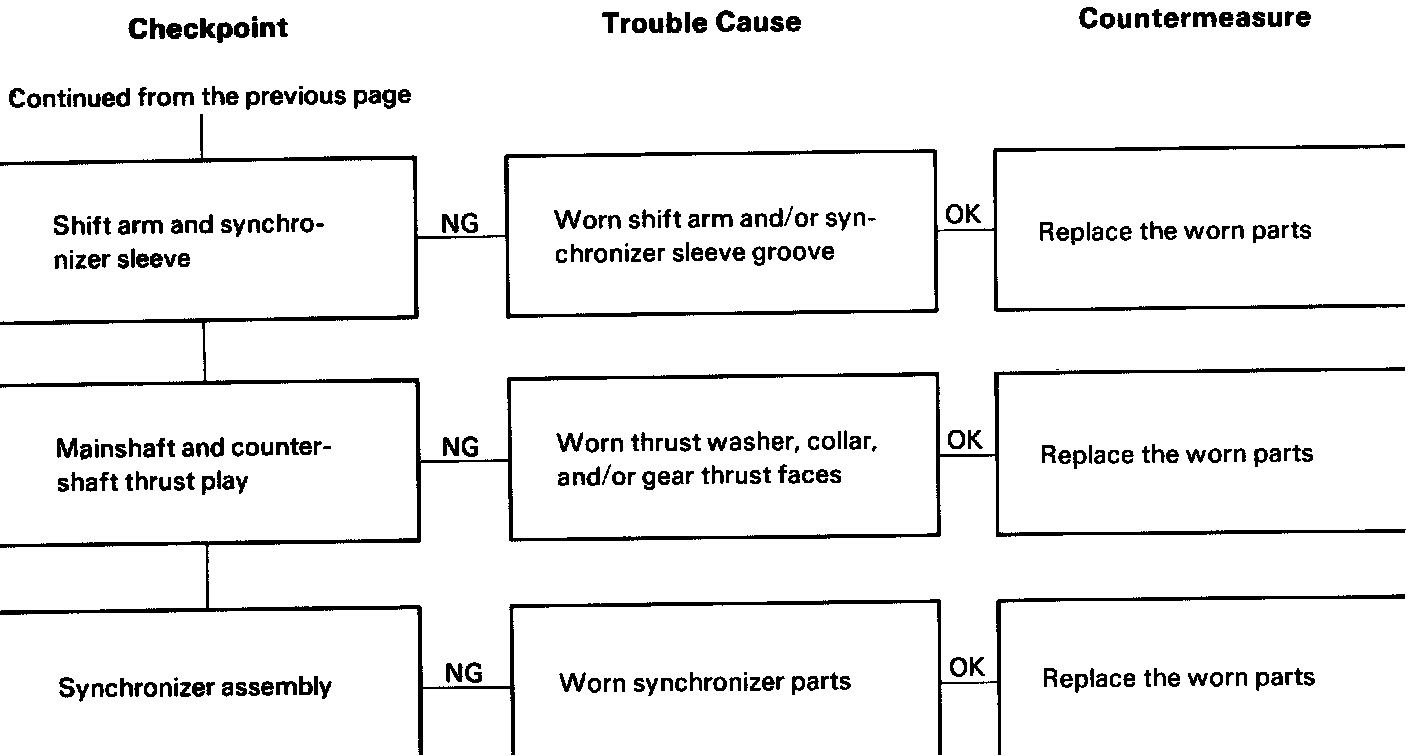 If noises arise around the transmission with the gear shift lever in neutral and with the engine at idle, depress the clutch pedal. If the noises stops when the clutch is disengaged, it indicates that the trouble lies within the transmission unit.