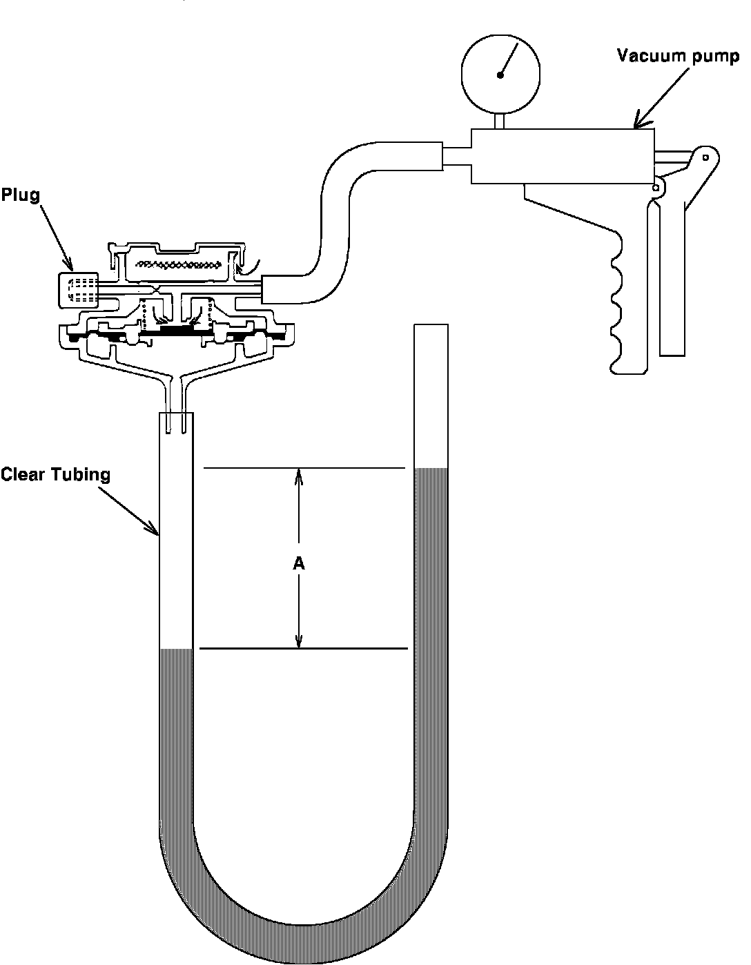 6. Lower open end of tubing slowly. When distance "A" is less than approximately 2", air should be allowed into the transducer BPT (vacuum as shown on vacuum pump gauge should go to zero.)
