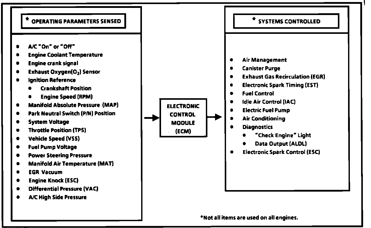 An Electronic Control Module (ECM) monitors data from various sensors and controls functions such as air/fuel ratio, emission control devices and on-board diagnostics.