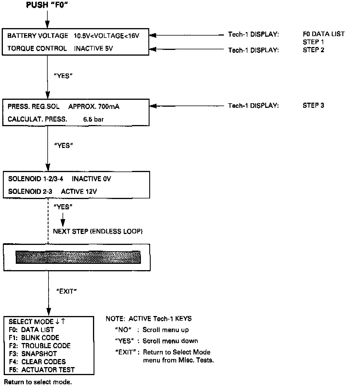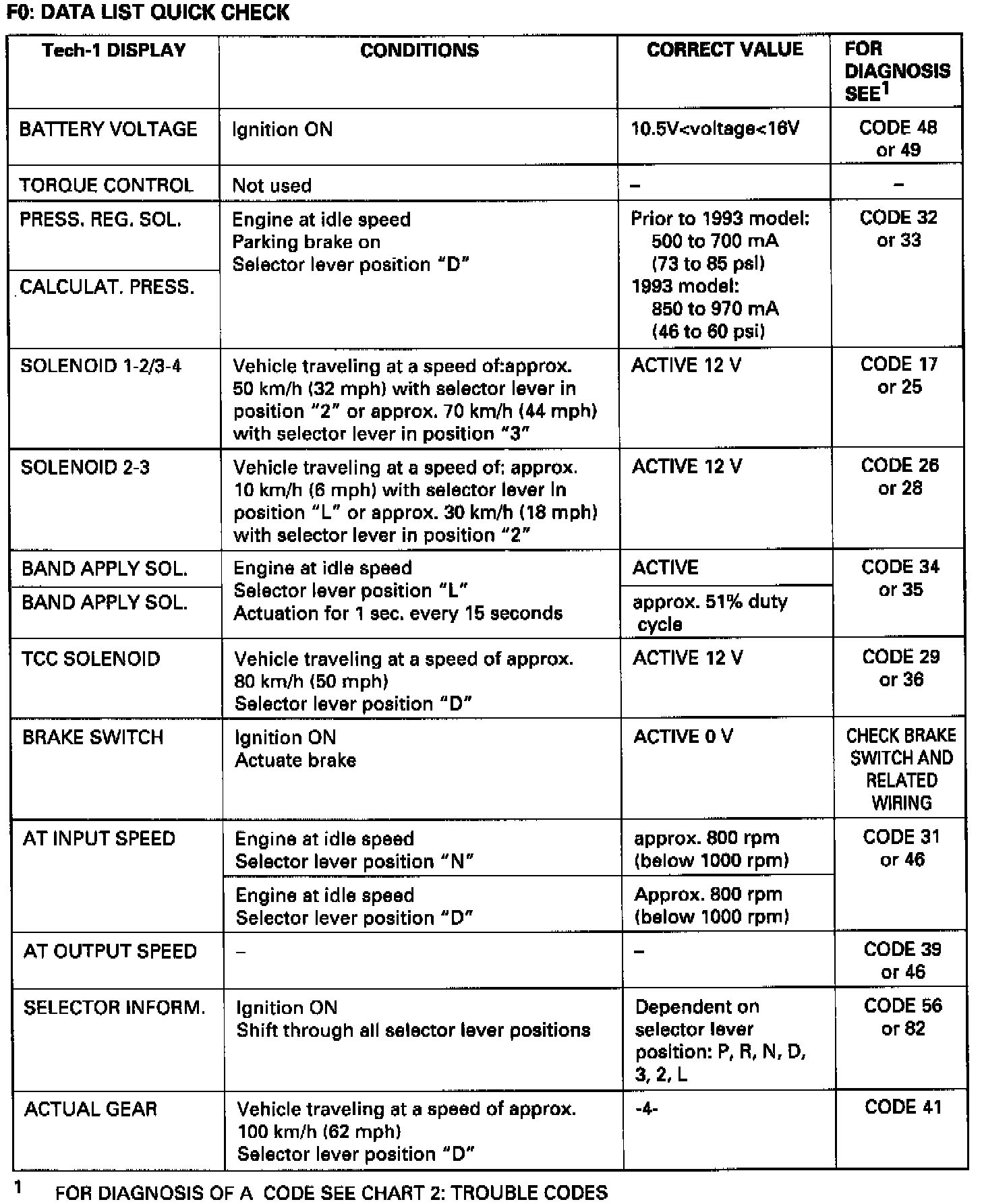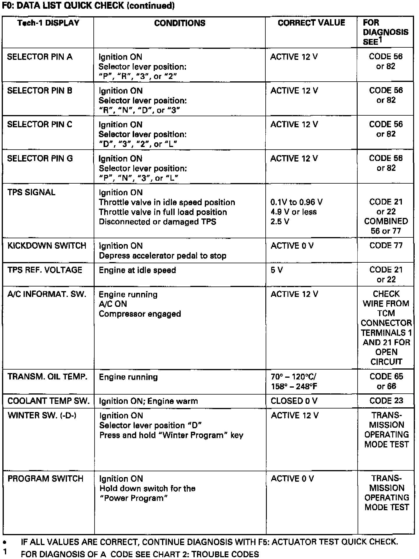 The current actual values of all important sensors and signals in the system are displayed through Mode F0. The displayed actual values must then be compared with the specifications listed in the Checking instructions. From these the trouble can be clearly diagnosed. In the Quick Check list, all the test steps are summarized, so that (for example), after a mechanical/hydraulic problem, the electronic functions can also be quickly checked.