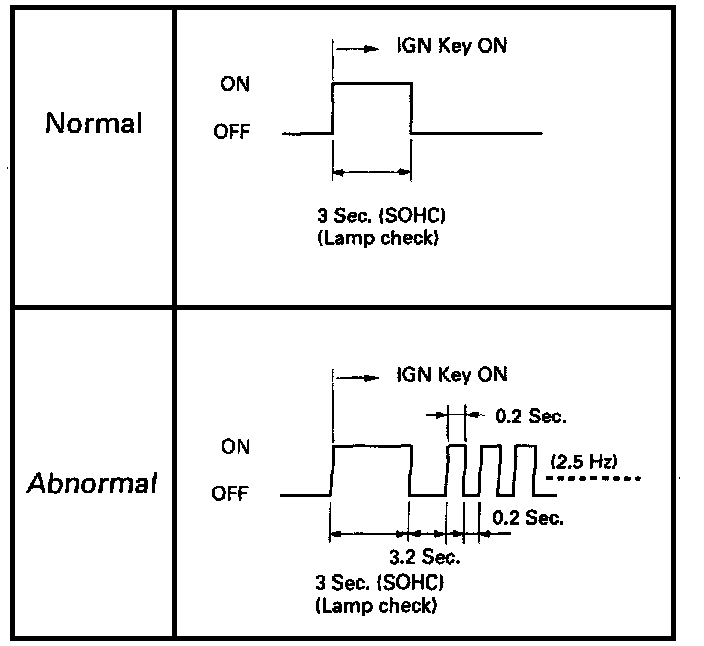 b. If it is flashing and the flash is 0.2 seconds "ON" and 0.2 seconds "OFF", this means that you should have a DTC stored. Recheck and if you find the same problem, refer to TCM MEM-CAL Replacement. Service and Repair
